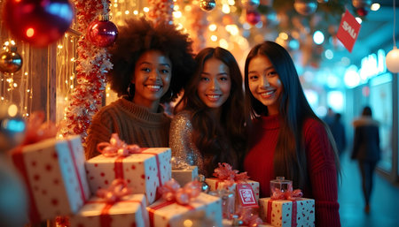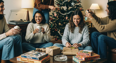 A joyful group of friends celebrates the holiday season surrounded by twinkling lights and festive decorations. Their warm smiles and gifts reflect the spirit of togetherness and happiness.