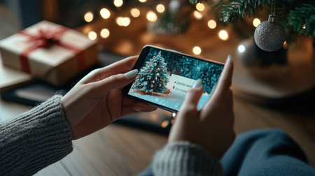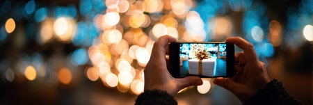 Hands hold a smartphone focused on a festive gift, set against a backdrop of twinkling lights from a Christmas tree during the holiday season.