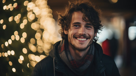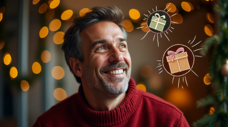 A man wearing a warm sweater beams with joy, surrounded by twinkling holiday lights and cheerful gift illustrations, embodying the spirit of Christmas.