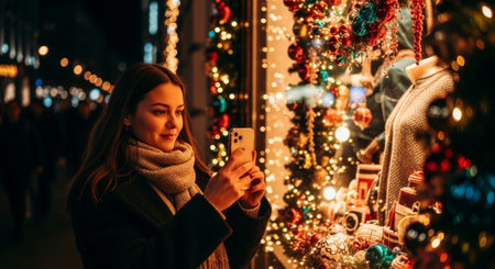 The image features a young woman using her phone to photograph a festive Christmas window, showcasing the holiday season and the beauty of city lights, suitable for festive campaigns.