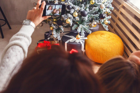Mother with little boy son having video call with grandmother via mobile phone during holiday season, mom and kid sitting near xmas tree talking online with family via smartphone, selective focus