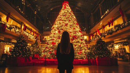 A person admires a beautifully decorated Christmas tree in a festive indoor setting during the holiday season