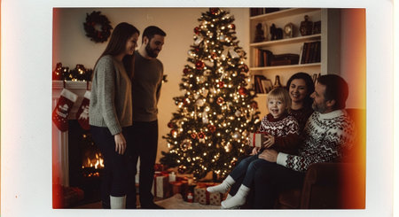 A family poses for a photograph in front of a large, elaborately decorated Christmas tree. The scene features a bright, indoor environment, with warm lighting and festive decorations. The image has a candid, documentary style that could be used for advertising, or editorial content related to the holiday season.
