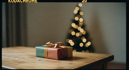 A beautifully wrapped gift box with a ribbon on a wooden table, with a blurred Christmas tree in the background adorned with lights