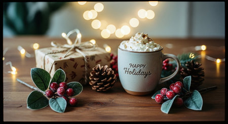 A cozy holiday scene featuring a mug of hot chocolate topped with whipped cream, surrounded by pine cones, red berries, and a beautifully wrapped gift, with soft bokeh lights in the background
