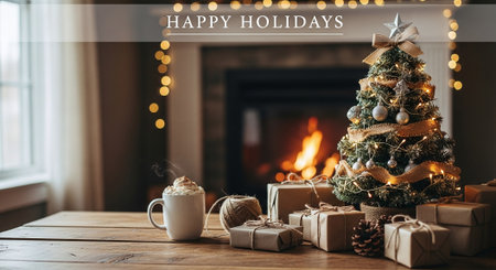 A cozy holiday scene featuring a decorated Christmas tree, gifts, and a cup of hot cocoa with whipped cream, all set near a fireplace with warm lighting