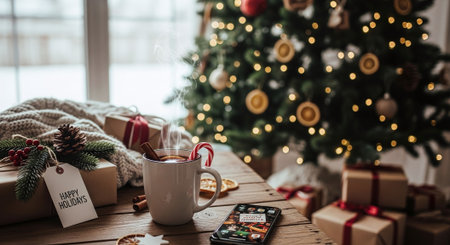 A cozy holiday scene with a small decorated christmas tree in a pot, wrapped gifts, a smartphone with a festive app, and two mugs with cinnamon sticks on a white table with soft bokeh lights.