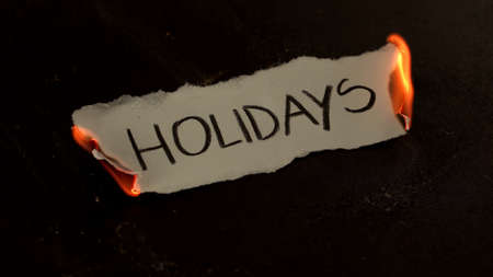 Holidays word written on white paper burns. Fire with smoke and ashes on black background