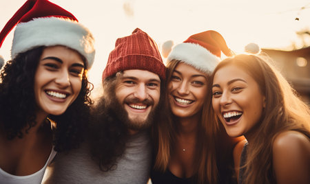 A group of friends having fun and celebrating Christmas outdoors with golden hour light