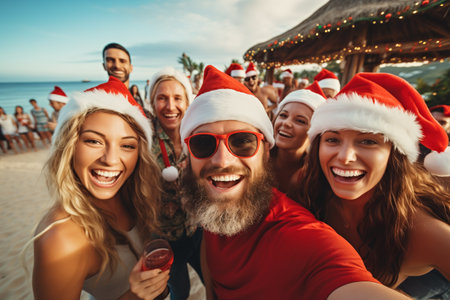 group of cheerful people in santa claus hats at a beach party
