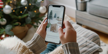 A person is holding a cell phone and looking at a Christmas tree on the screen. Concept of warmth and holiday cheer, as the person is likely enjoying the festive decorations