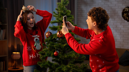 woman taking picture on the phone near christmas tree cozy place