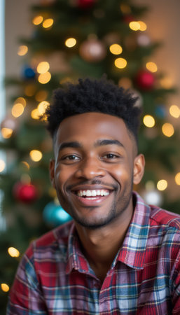 A cheerful young Black man with a bright smile poses in front of a festive Christmas tree adorned with colorful ornaments and twinkling lights. His plaid shirt adds a cozy touch to the warm holiday atmosphere, radiating joy and celebration.