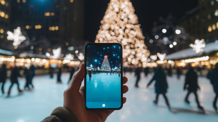Capturing a festive moment at night with a smartphone in front of a Christmas tree