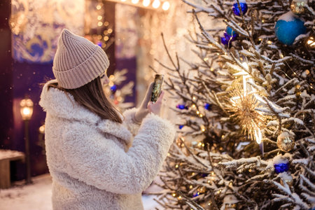 A young female tourist takes a photo on her smartphone of a Christmas tree in a modern city