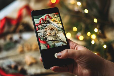 Female hand takes a photo on the phone of christmas cookies in the form of numbers 2020 on a wooden table with fir tree branches decoration and bokeh lights.