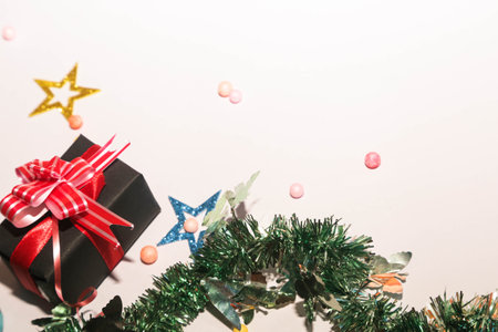 Season's greetings scene. Christmas decorations,gift boxes with red ribbons, Ñhristmas balls, rustic star, holly berries, frosty spruce branches, confetti on white backdrop, selective focus with blur
