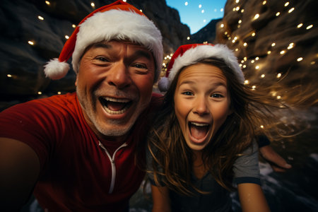 Two cheerful friends wearing Santa hats take a joyful selfie during the Christmas season, surrounded by twinkling lights and festive decorations, capturing happy moments together.