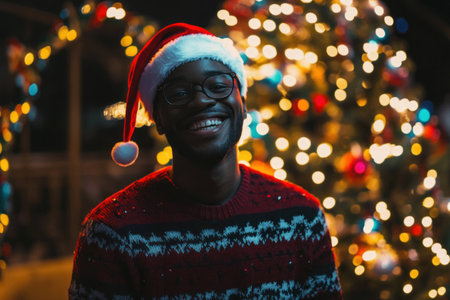 Joyful African man in Christmas sweater and Santa hat smiling against a festive background with Christmas tree lights, capturing the spirit of the holiday season