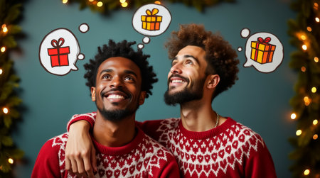 Two men, an interracial couple, gaze upwards with joyful expressions, envisioning gifts in thought bubbles. They are dressed in matching holiday sweaters, embodying festive spirit.