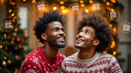 A joyful interracial male couple gazes upwards, smiling with dreams of gifts in a warm, festive atmosphere filled with twinkling lights, celebrating togetherness.