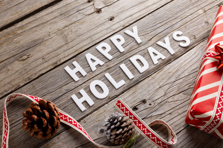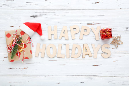 Text HAPPY HOLIDAYS, Christmas gift boxes and decor on wooden background