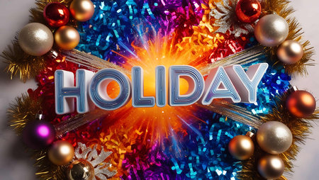Holidays greetings on a colorful background with tinsel and Christmas balls