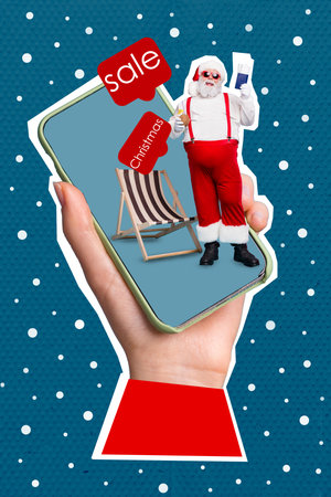 Creative drawing collage picture of arm holding device telephone santa claus costume lounger vacation weekend resort sale shopping tickets
