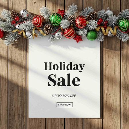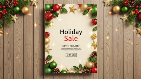 A colorful holiday sale background featuring wrapped gifts, discount percentages, and holly leaves, perfect for a cheerful, seasonal shopping event.