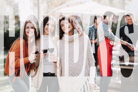 Women Company Are Drinking A Wine On Barbeque Vacation. Smiling Friends Are Having Fun. Resting Together. Sunny Day. Sweater Weather. Outside Relaxing Activity Concept. Holiday Company Meeting.