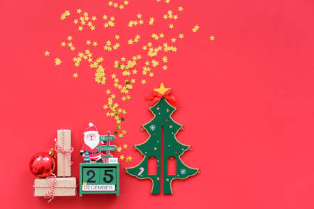 Christmas composition. Christmas red decorations, fir tree branches on red background. Flat lay, top view, copy space