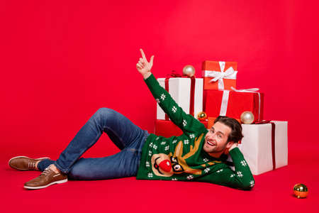 Full length body size photo man laying near gift boxes pointing up on xmas holidays isolated vivid red color background