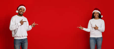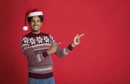 Smiling african american millennial man in sweater and santa claus hat, points fingers to empty space, isolated on red background, studio shot