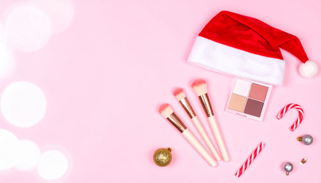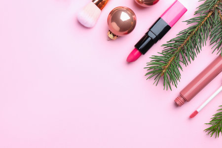 Make up cosmetics and Christmas decorations on artistic pink background, copy space, top view