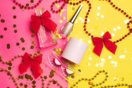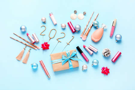 Flat lay of christmas ball, gift and cosmetic. Holiday Background. Beauty concept.