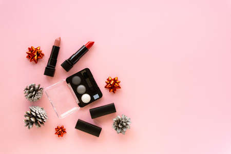 Christmas or new year flat lay of makeup products and decorations. Eyeshadow palette and lipstick on a pink background