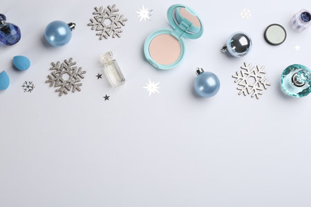 Flat lay composition with decorative cosmetic products on light background. winter care. Space for text