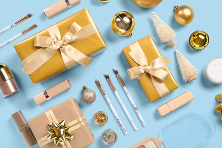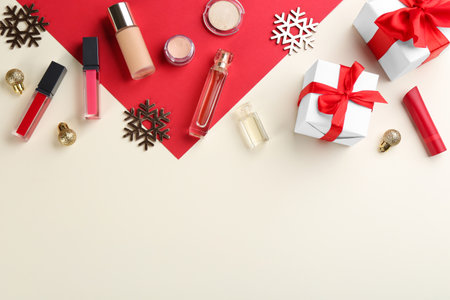 Flat lay composition with makeup products and Christmas decorations on pastel beige background