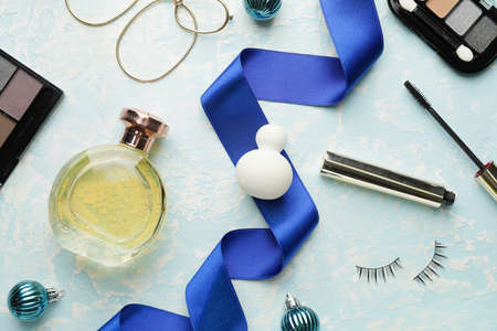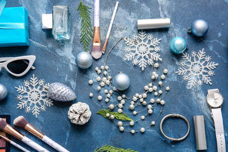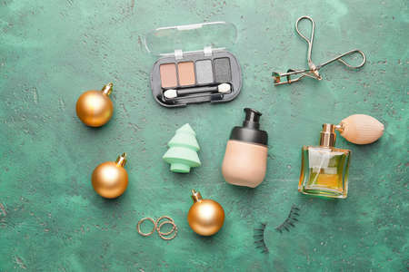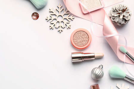 Set of cosmetics with makeup brushes and Christmas decor on color background