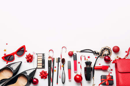 Women's accessories, cosmetics and makeup tools with Christmas decorations on a white background. Winter beauty fashion concept concept flat lay top view.