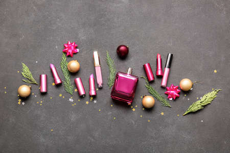 Christmas frame made of decorative cosmetics, nail polishes, decorations and gifts. Flat lay, top view.