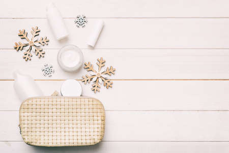Top view composition of small traveling bottles and jars for cosmetic products with Christmas decorations. Facial skin care concept with copy space for your design. Cosmetic mock up