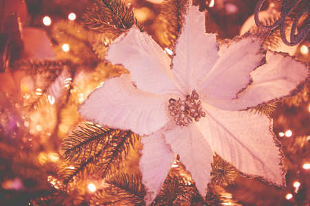 Festive christmas tree with decorations, christmas flowers, light garlands. Selective focus. Winter holiday, Happy New Year
