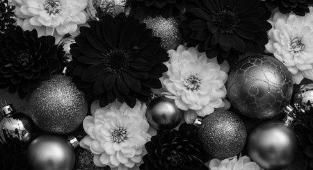 Black and white background with christmas balls and dahlia flowers