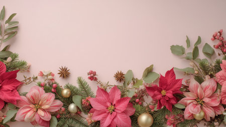 A beautifully arranged collection of flowers and ornaments set against a soft pink background, perfect for inspiring festive decor ideas during the holiday season.