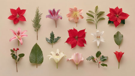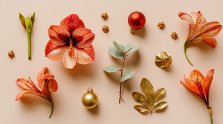 A stunning layout showcasing bright red and white flowers alongside dried botanical accents against a soft beige backdrop, ideal for festive decorations or artistic inspiration.