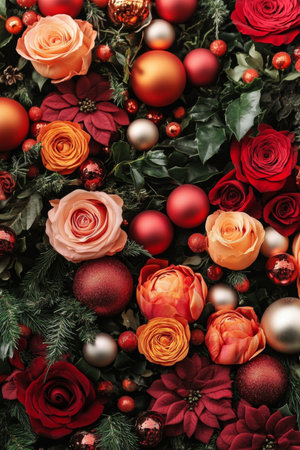 A vibrant arrangement of flowers and ornaments in red white and gold surrounds a deep green center creating a festive atmosphere.