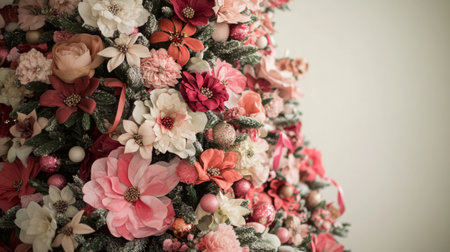 Christmas tree decorated with poinsettias, pine cones, green branches.