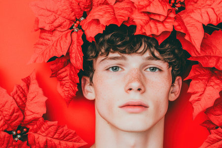 Young man with curly hair surrounded by vibrant red leaves, exhibiting a calm expression against a bright orange backdrop, ideal for seasonal themes
