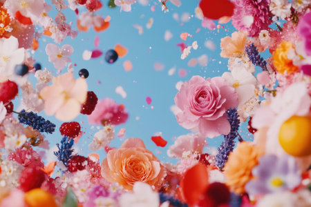 Colorful floral arrangement with blooming flowers, vibrant petals, and berries against a bright blue background, evoking joy and celebration in a spring setting